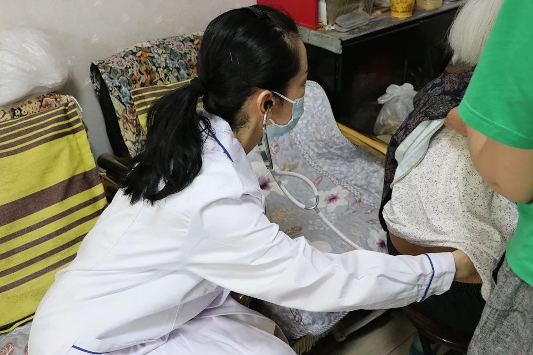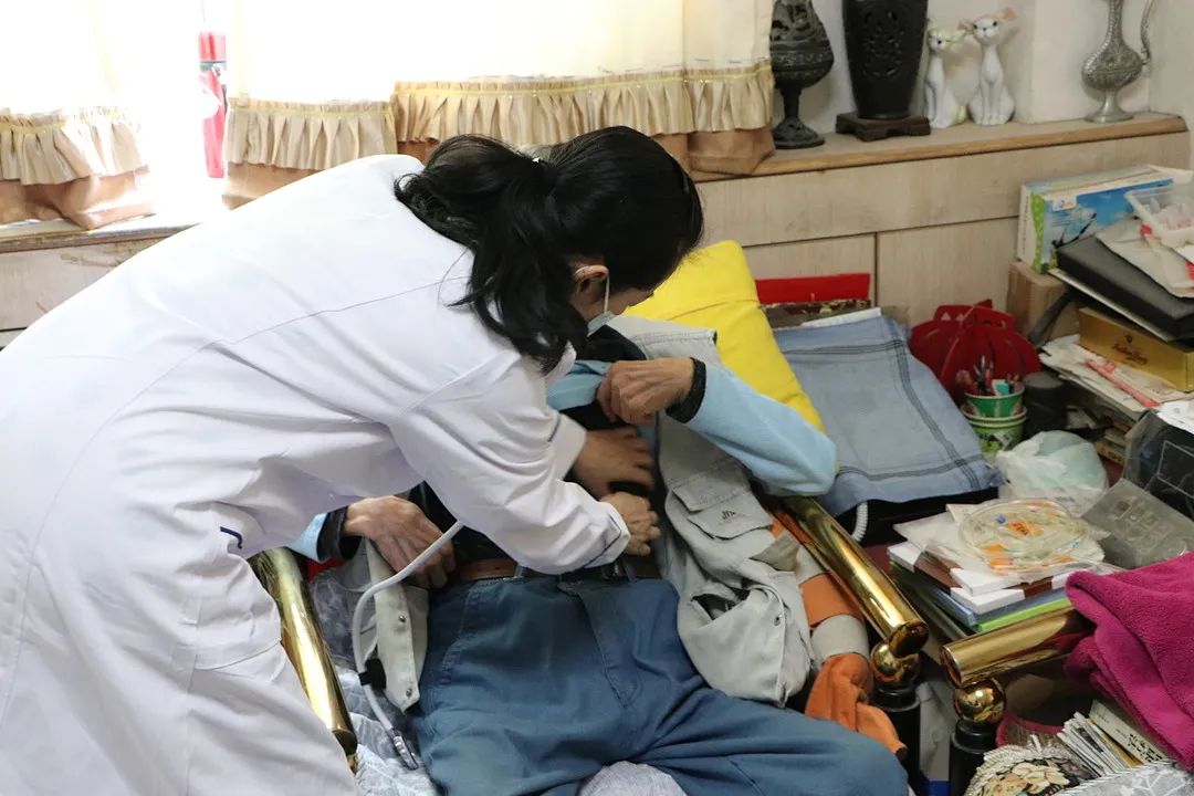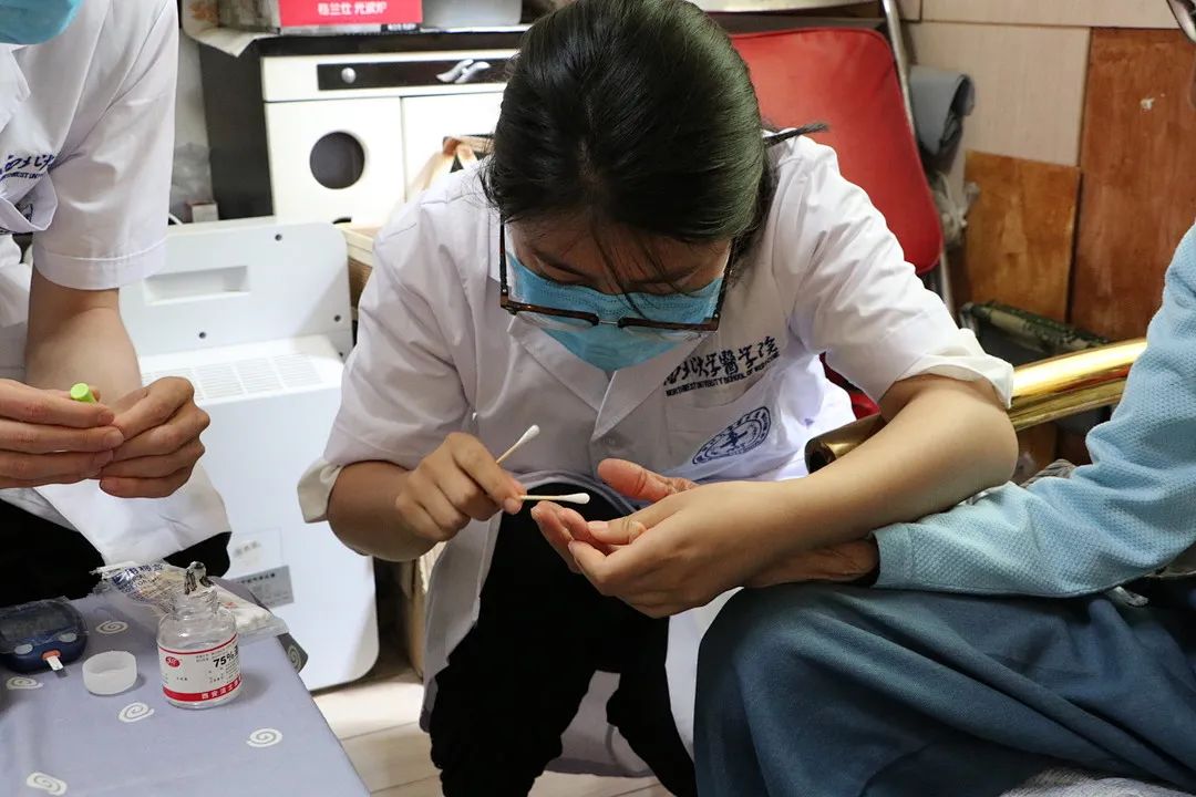 在离退休教师家中,赵钢、吴大方仔细了解病史、诊断病情,询问服药情况。同学们为老教师测量血糖、血压、心率和体重等指标,为老教师建立健康档案。赵钢、吴大方医师认真检查患者的身体情况,与患者、患者家属细心沟通交流,耐心解答患者及其家属的疑惑,给出治疗、饮食等建议,还为每位患者提供专业的健康意见。