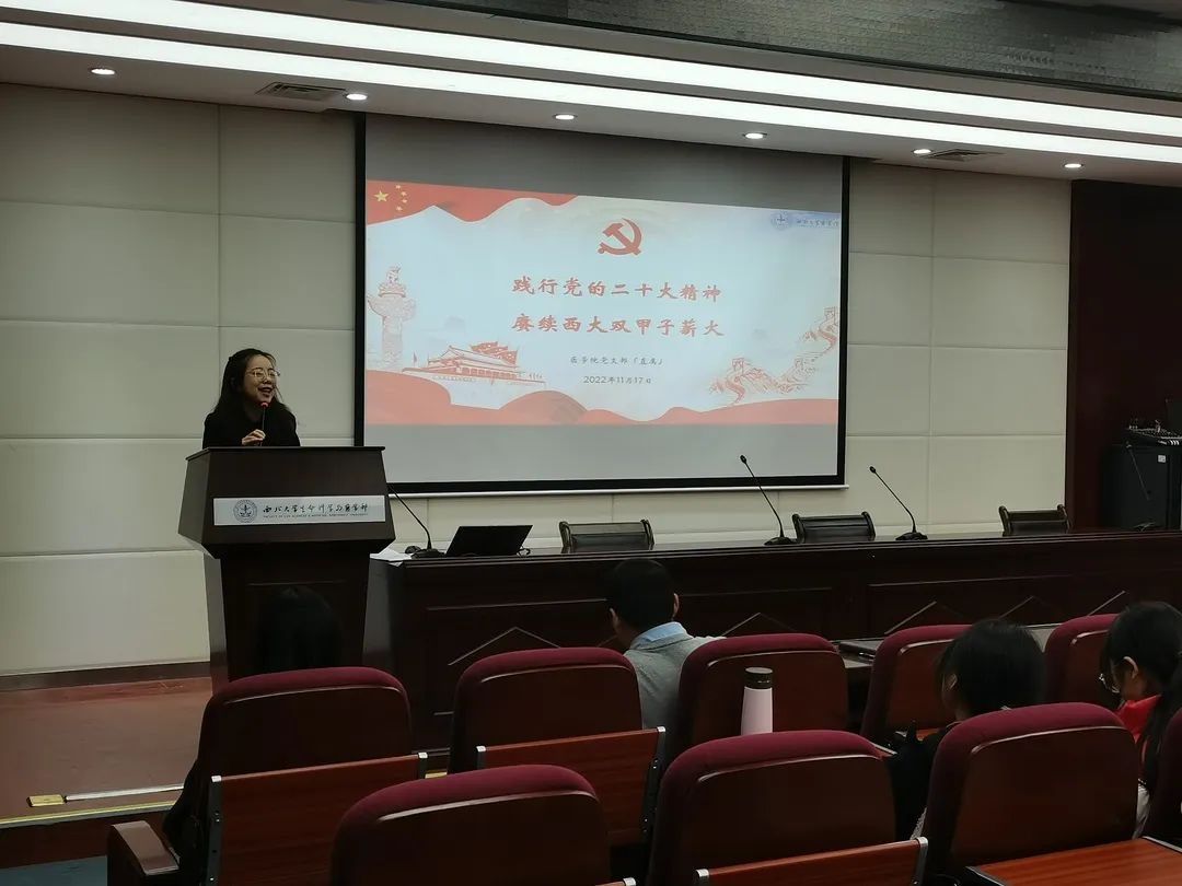 为学习贯彻党的二十大精神,积极响应落实深入实施科教兴国战略、人才强国战略、创新驱动发展战略重大使命,把全体师生的思想认识统一到党的二十大精神上来,凝聚到党的二十大各项工作上来,2022年11月17日,pp电子游戏官网党支部(直属)组织全体入党积极分子和大一新生,聆听了由赵军龙副教授主讲的“践行党的二十大精神,赓续西大双甲子薪火”启蒙党课,进一步促进党的二十大精神入脑入心,激励医学青年不忘初心,牢记使命,砥砺前行。