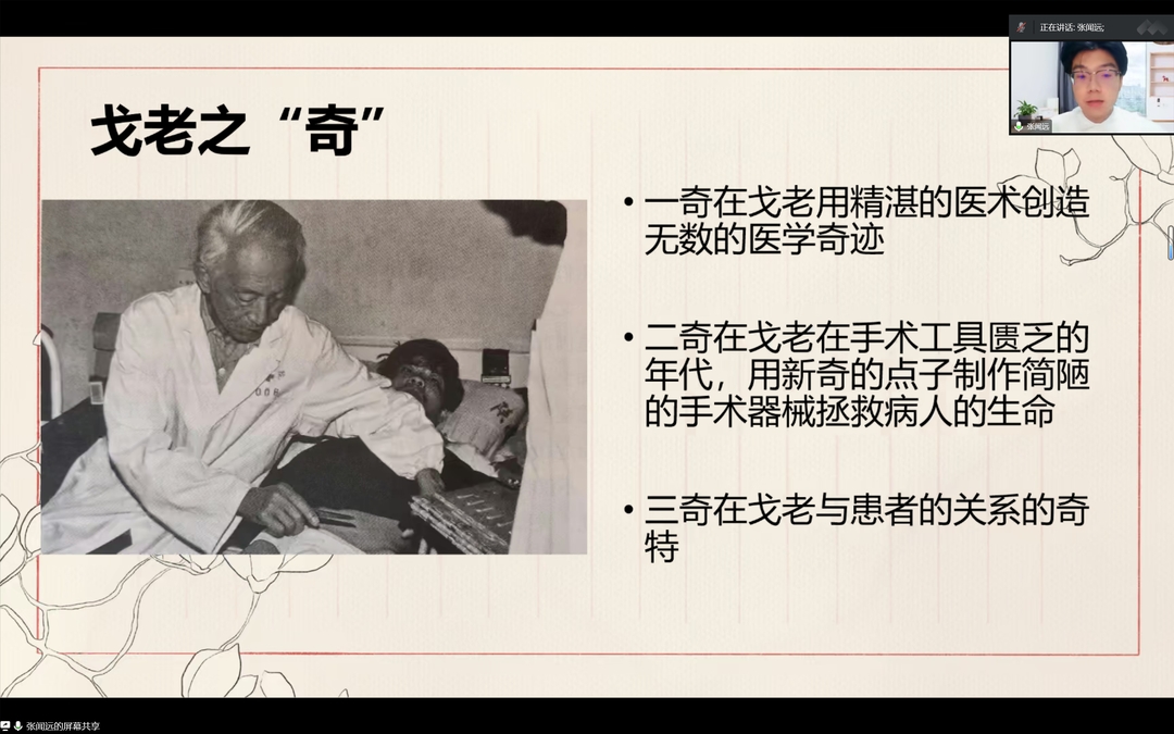 3组以题为“奇严怪实的医学泰斗——缅怀戈治理教授”的演讲报告,重点讲述了戈治理教授之“奇”、之“严”、之“怪”,之“实”。“春风化雨育桃李,仁心仁术暖杏林”是对这位我国神经外科创始人和奠基人的最好写照。
