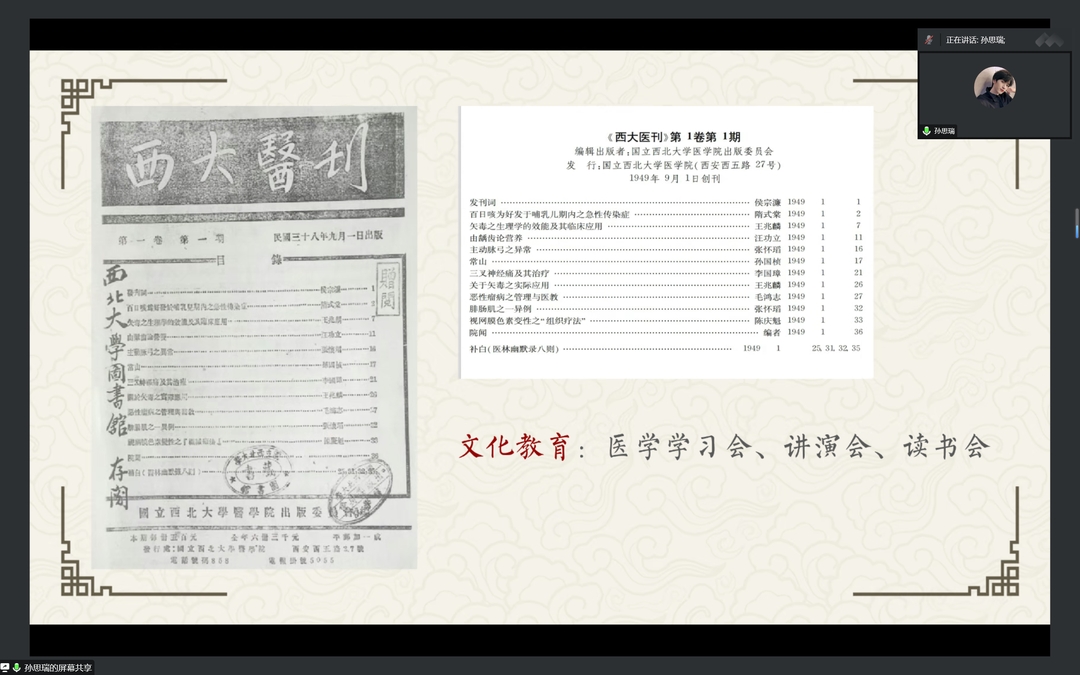 2组从pp电子游戏官网院刊着手,研读《国立西北pp电子游戏官网院刊》和《西大院刊》,展示了当时pp电子游戏官网基本情况以及医学生学习详情,主张我们要学习医学史,传承医学精神,不负历史厚望。