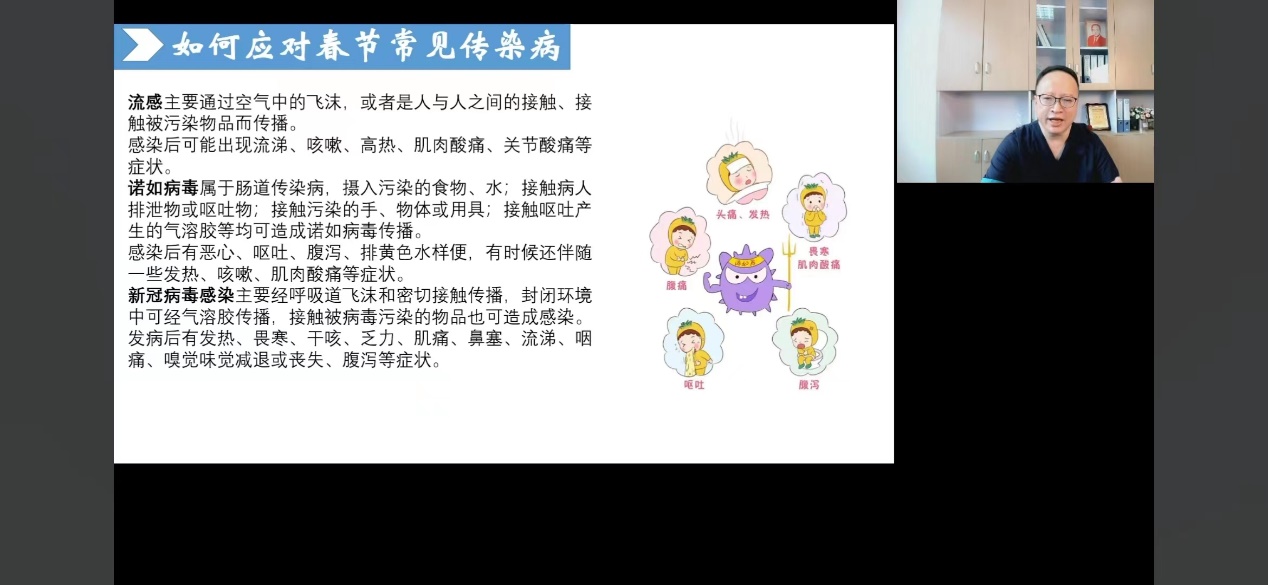 3月23日,pp电子游戏官网孟勇教授为我校幼儿园师生、家长代表近500人带来“幼儿春季传染病及预防”为主题的线上科普讲座。孟教授围绕免疫力、病毒、传染病三个关键点,详细讲解了免疫力的形成机制、春季常见传染病应对策略、诺如病毒的防控方法,以创新、趣味、生动的形式进行医学健康科普知识的推广,将幼儿健康管理落到师生、家长实际行动上,让科普成为家校“定心丸”,成为幼儿健康“保护网”。