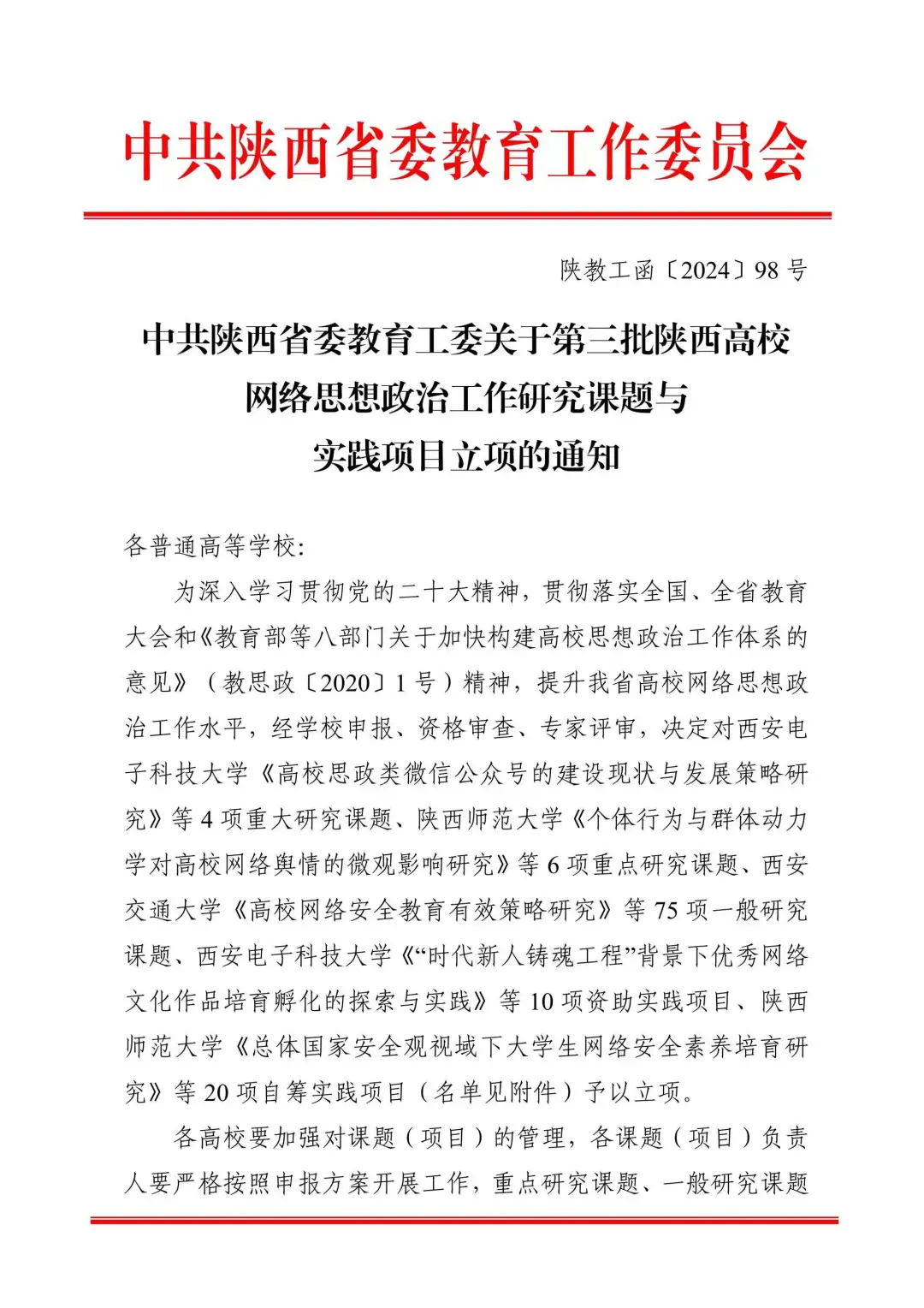 近日,陕西省委教育工委、陕西省教育厅发布《关于开展第三批陕西高校网络思想政治工作研究课题与实践项目申报工作的通知》,pp电子游戏官网外科教研室主任、pp电子游戏官网附属医院(西安市第三医院)普外四科主任孟勇教授主持的《基于“抖音”的网络育人品牌建设研究》项目获批立项。
