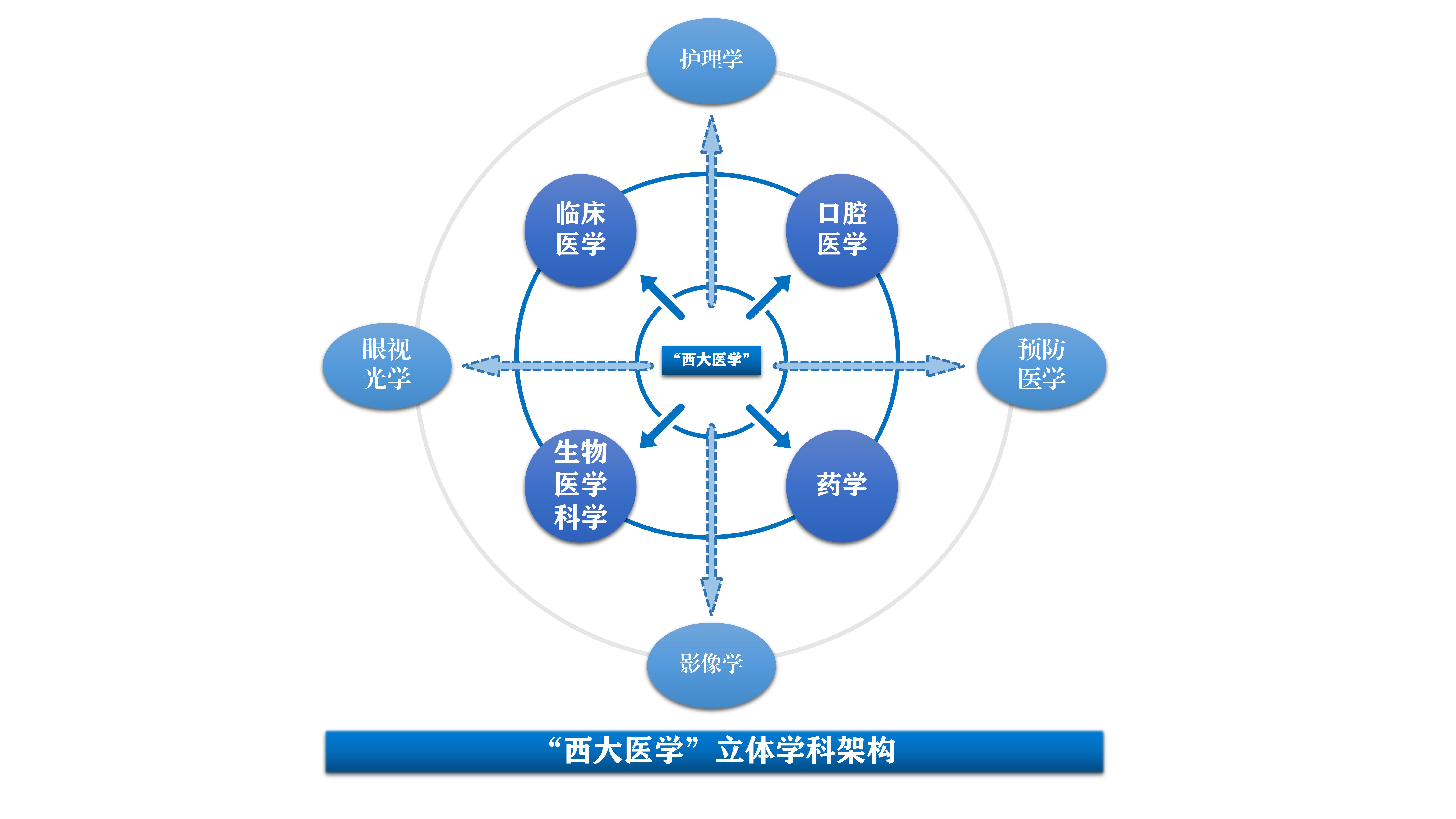 “西大医学”立足西部医疗人才需求,坚持“小规模、高起点、有特色”办学定位,凝练“较高科研素养和良好人文精神的医学科学家”人才培养目标,搭建临床医学、口腔医学、生物医学科学、药学、护理学、眼视光学、预防医学、影像学立体学科架构,完善基础医学、临床医学、口腔医学、麻醉、感染、重症、儿科学位点建设,坚持加强素质教育、实施专业教育思路,践行“早临床、早早临床”培育理念,致力于培养医德医风高尚、医学基础扎实、临床技能过硬、人文素养高、创新能力强的德智体美劳全面发展的医学专门人才。
