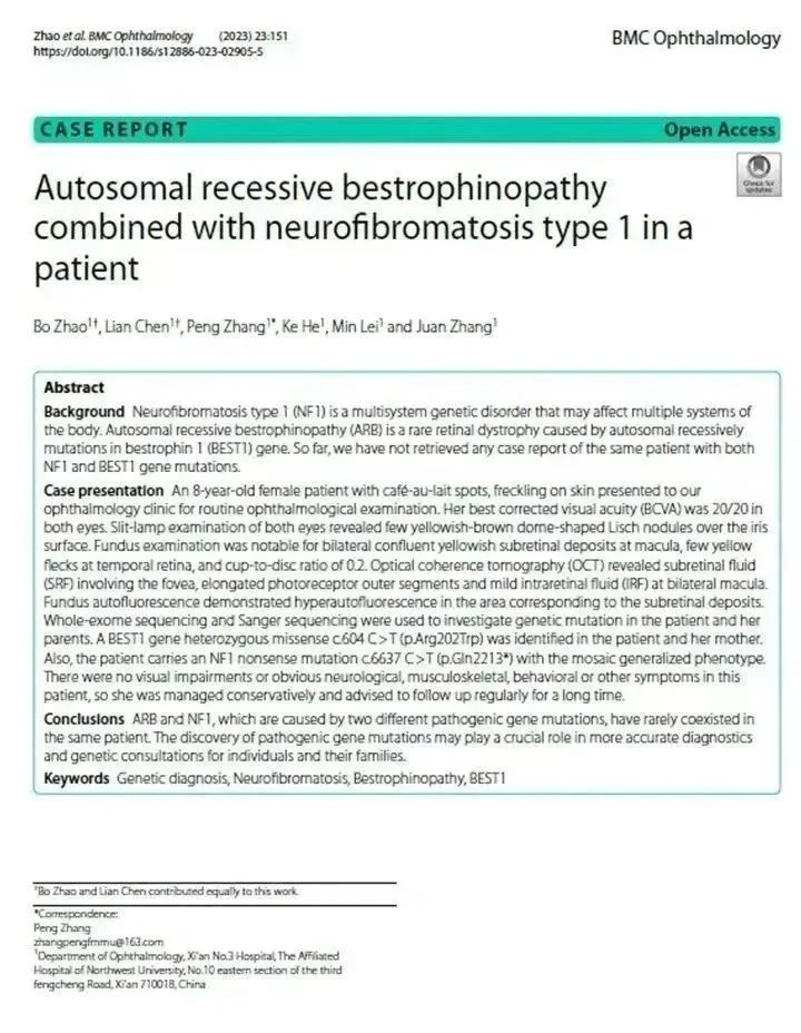 日前,BMC Ophthalmology杂志刊发了pp电子游戏官网附属医院·西安市第三医院眼科张鹏主任团队撰写的“Autosomal recessive bestrophinopathy combined with neurofibromatosis type 1 in a patient”一文,赵博主治医师及陈莲副主任医师为该文的共同第一作者。该文对一例患有1型神经纤维瘤合并双眼常染色体隐性遗传性Best病变的病例就多模式影像学特征、基因突变位点、病理机制等进行了探讨。常染色体隐性遗传性Best病变为临床罕见疾病,为BEST1基因突变导致的双侧黄斑营养不良,部分患者可合并闭角型青光眼。而1型神经纤维瘤为累及多系统的遗传性疾病,与NF1基因突变有关。经查,同时合并NF1及BEST1基因突变的病例迄今为止在全球尚未有文献报道。因此,该文系全球首篇对NF1及BEST1基因突变导致全身及眼部出现病变的患者进行诊断及病因分析的临床病例报道。