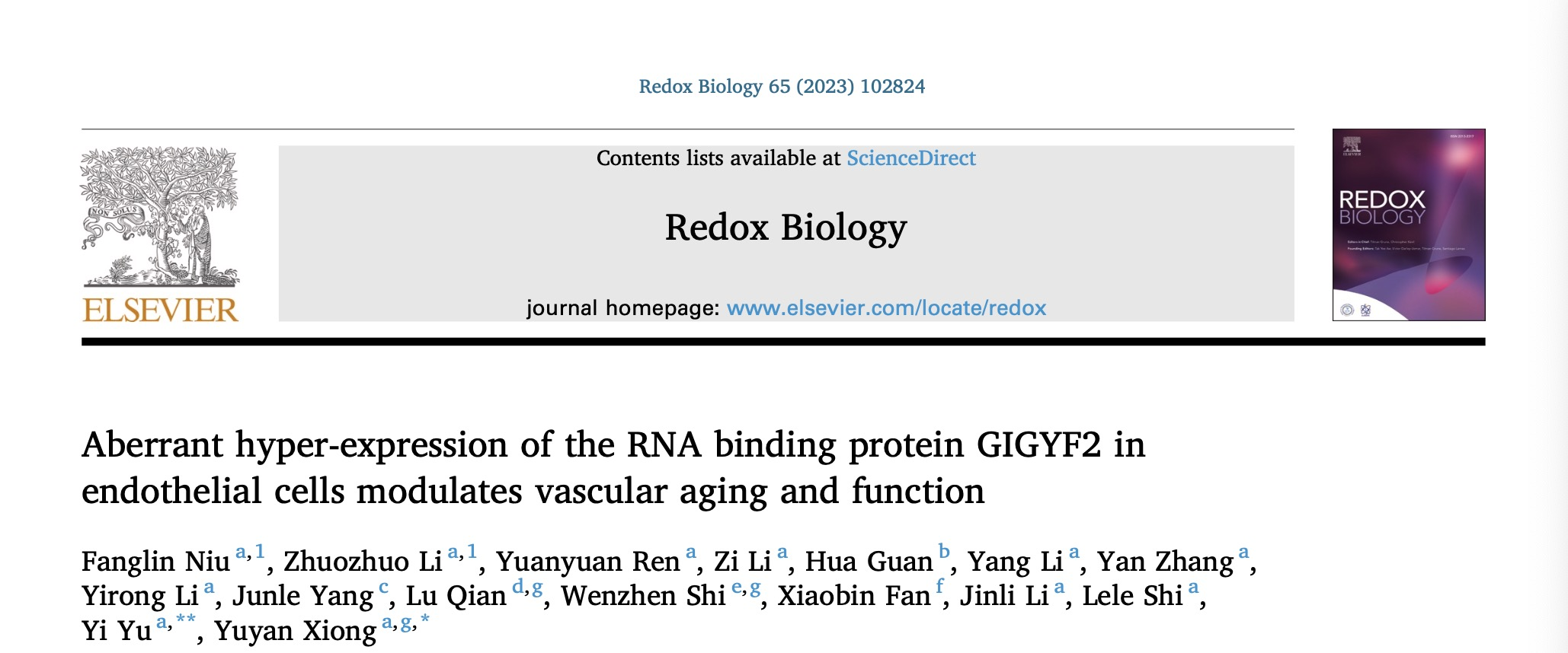 近日,pp电子游戏官网生命科学与医学部熊裕焱教授团队在GIGYF2在血管内皮细胞衰老中的生物功能及其调控机制的研究中取得了新进展,研究结果以研究长文(Article)形式发表在《Redox Biology》杂志上,题名为“Aberrant hyper-expression of the RNA binding protein GIGYF2 in endothelial cells modulates vascular aging and function”。