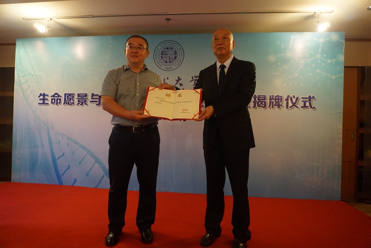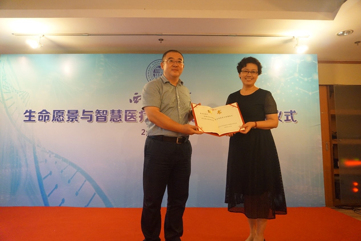 常江和巨栓科共同为生命愿景与智慧医疗研究院揭牌。揭牌仪式上,李振海宣读研究院成立文件并宣布研究院院长及首席科学家名单,常江为姚研成先生和崔亚丽教授颁发聘书并致辞。