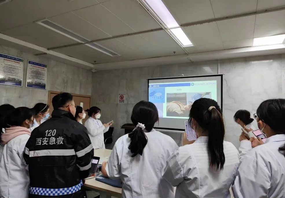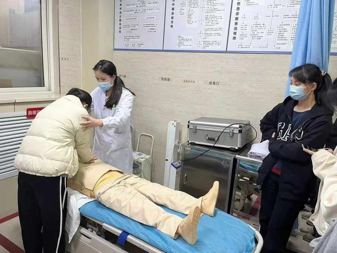 见习期间,临床医学班在科室负责医生的指导下,参观学习了急诊室各功能区,了解了科室场地设置人员配置、排班设备设施、患者就诊流程等情况。在急诊门诊、急诊抢救、急诊病房区域,同学们观摩了急诊科室早交班工作,学习了临床坐诊过程中患者就诊流程及病情诊疗经过。见习过程中,带教老师进行了心肺复苏,电除颤操作、监护仪使用、无菌手套佩戴等临床技能培训。