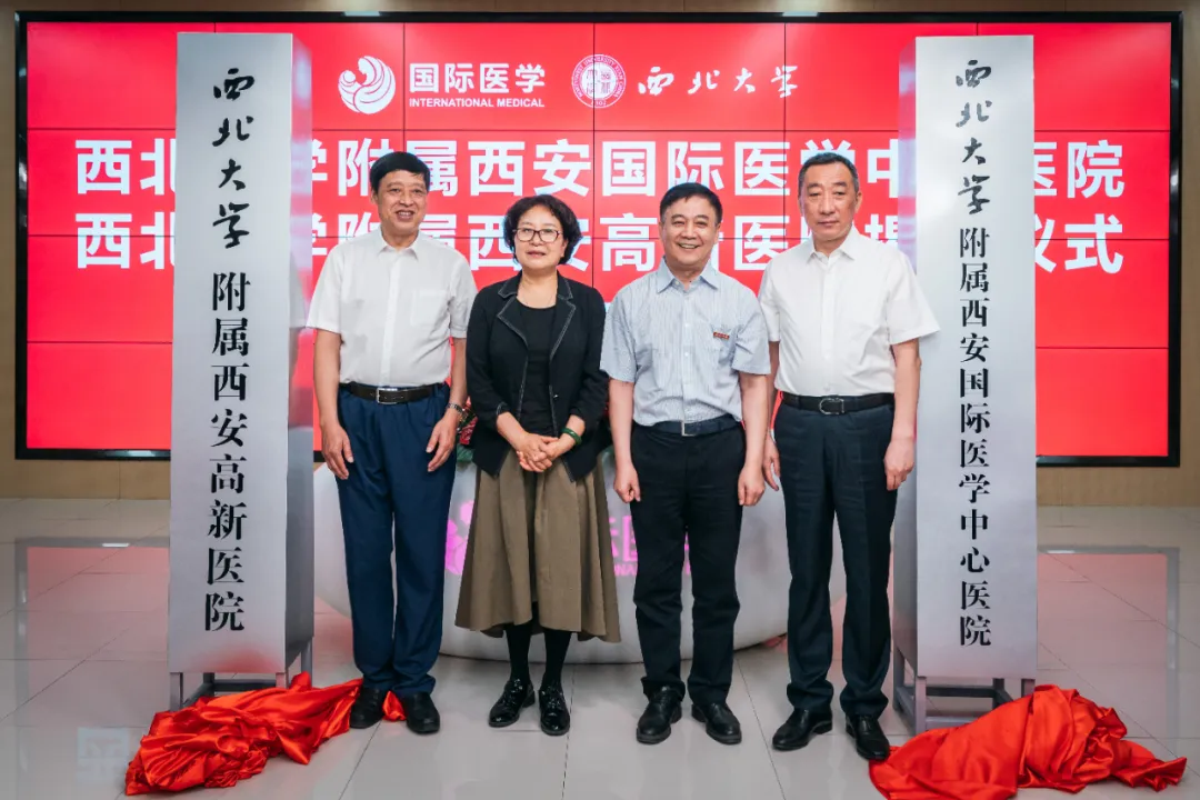 陕西省卫健委主任刘宝琴,pp电子游戏官网党委书记王亚杰,校党委常委、副校长、生命科学与医学部主任常江,国际医学董事长史今,副总裁孙文国,西安国际医学中心医院院长尹强,西安高新医院院长马庆久出席仪式。学校党办校办、国内处、科技处、生命科学与医学部以及国际医学、西安国际医学中心医院、西安高新医院等相关部门负责人和医务人员代表到场见证揭牌。仪式由国际医学党委书记、总裁刘瑞轩主持。
