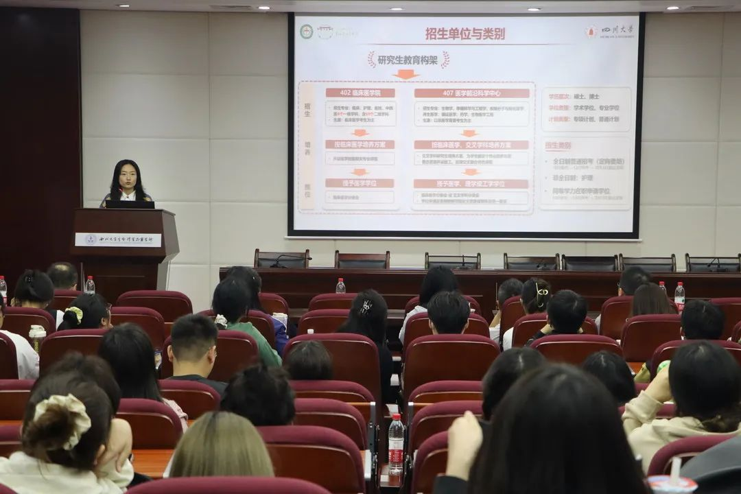 参会同学对宣讲内容兴趣浓厚、现场气氛热烈,学生代表围绕招生政策、科研平台等方面与宣讲老师展开深入的交流。各位老师对同学们提出的问题给予耐心解答,并热忱欢迎同学们积极报考四川大学华西医院。