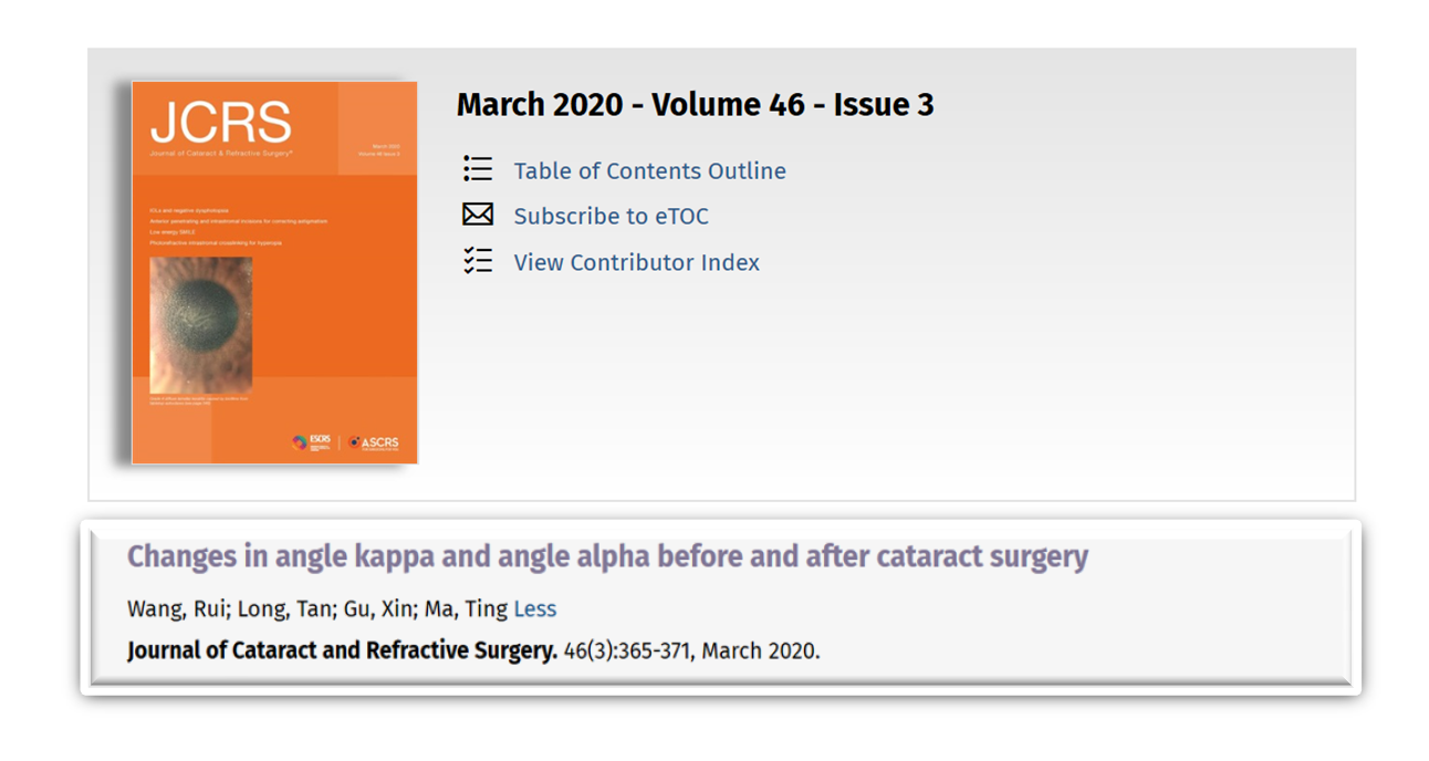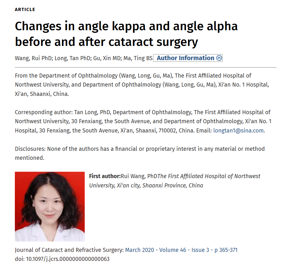 pp电子游戏官网附属第一医院(西安市第一医院)自2010年开展屈光白内障手术,致力于为患者提供精湛的医疗技术和理想的手术效果,10年来为数以万计的白内障患者带去了全新的视觉体验。近期,中心屈光白内障团队临床研究成果发表于JOURNAL OF CATARACT AND REFRACTIVE SURGERY杂志。该杂志是美国白内障和屈光手术学会(ASCRS)和欧洲白内障和屈光外科医师学会(ESCRS)官方期刊,内容涵盖眼前段手术的各个方面,包括临床研究、实用技术、重要案例、评论及基础研究等。
