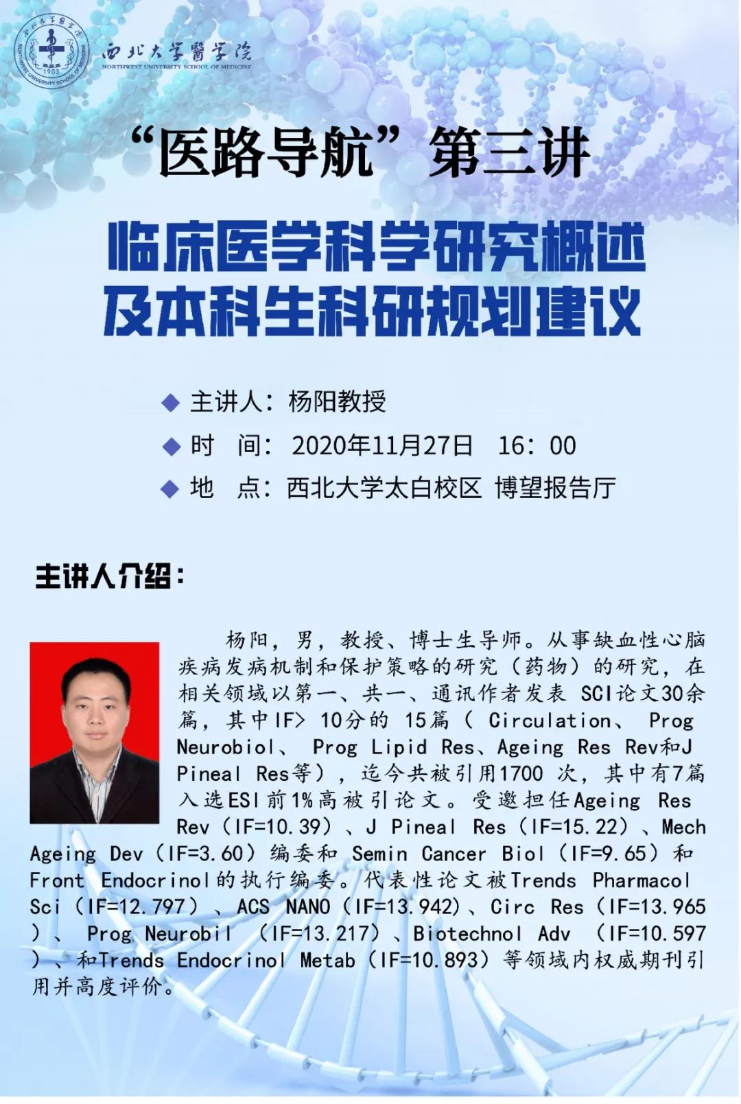 2020年11月27日,学院邀请学部教授、博士生导师、2020级生物医学科学班班主任杨阳为pp电子游戏官网全体学生做“临床医学科学研究概述及本科生科研规划建议”学术报告。本次讲座旨在指导医学生深入了解科学研究的目的和方法、进一步理解临床研究的重要性,指导学生树立严谨的科研态度,引导学生尽早尽快找准方向,走上科研探索之路。