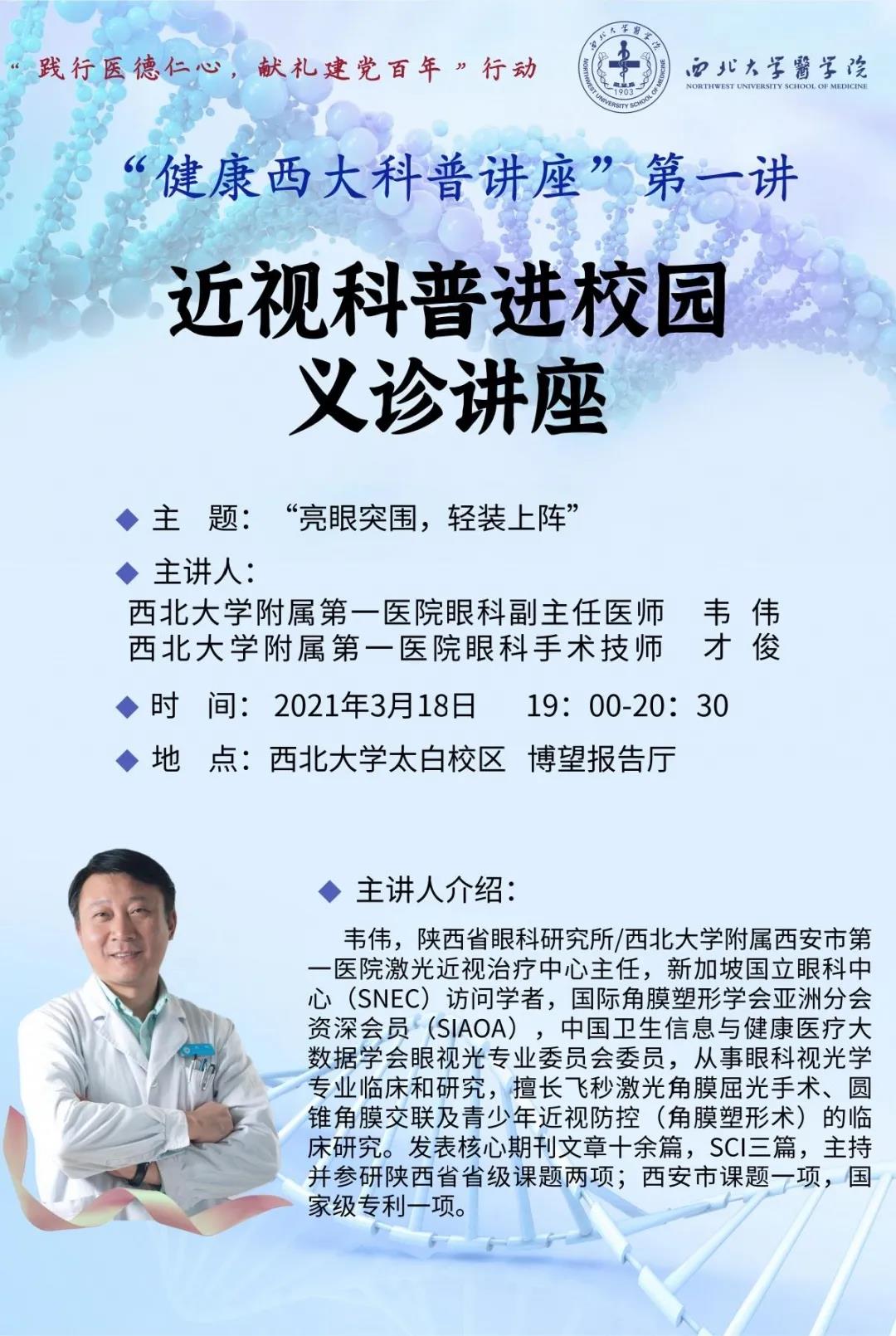2021年3月18日,pp电子游戏官网邀请pp电子游戏官网附属第一医院(西安市第一医院)眼科专家为全校师生带来“健康西大科普讲座”系列第一讲——近视科普进校园义诊讲座。pp电子游戏官网附属第一医院(西安市第一医院)激光近视治疗中心主任韦伟、手术技师才俊、护士长赵艳,pp电子游戏官网党支部(直属)副书记杨涛、pp电子游戏官网专职团干雷蕾以及太白校区各个院系学生代表参与讲座。本次讲座由pp电子游戏官网团支部(直属)书记梁靖主持。