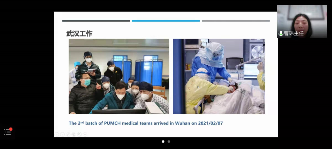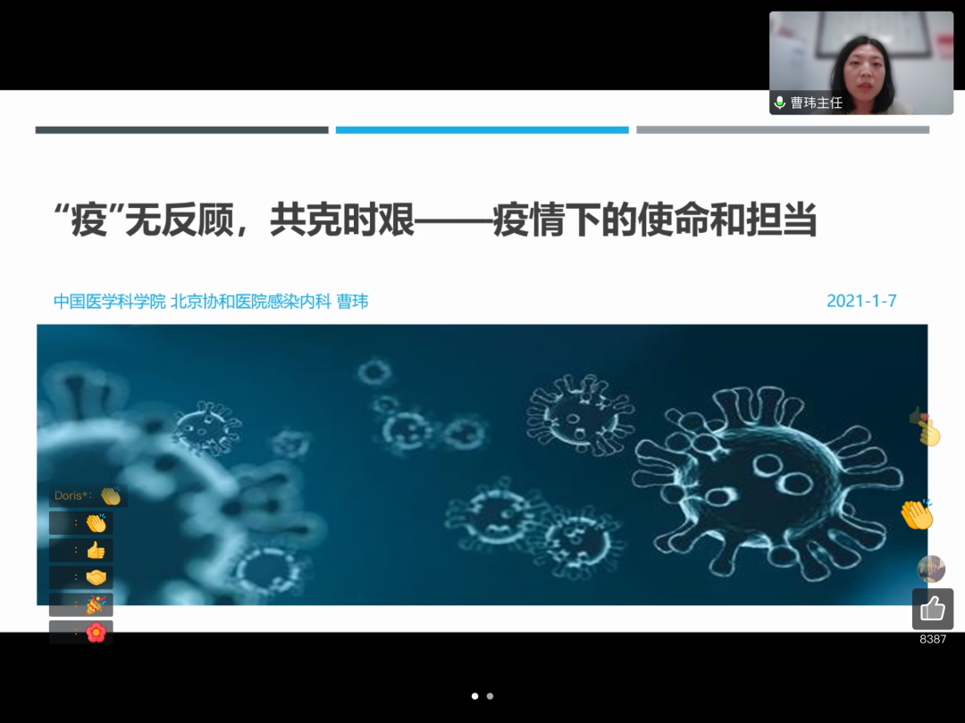 1月7日晚,pp电子游戏官网医学战“疫”大讲堂在腾讯会议端开讲,北京协和医院感染内科副主任、2020年初国家援鄂抗疫医疗队队员曹玮医生做客讲堂,作题为——“‘疫’无反顾,共克时艰,疫情当下我们的使命与担当”分享报告,全校师生在线观看。讲堂由生命科学与医学部主办,校党委副书记张清主持。