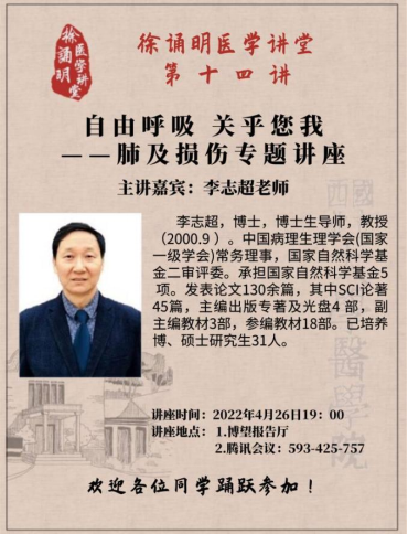为拓宽学生学术视野,加强学生专业能力,4月26日,学院邀请病理生理学教研室主任李志超教授为2020级全体学生作《肺及肺损伤》专题讲座。