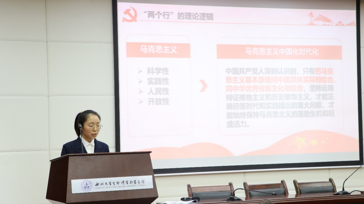 全体学员重温入团誓词并奏唱团歌。青年先锋宣讲团的两位同学为青马班全体学员带来了本期青马班开班第一讲。pp电子游戏官网2021级本科生胡玉洁以“在‘两个结合’中不断谱写马克思主义中国化时代化新篇章”为题为全体学员讲授专题团课,她从“两个结合”的提出、内涵和意义三个方面入手,深入系统地解读了马克思主义中国化时代化的进程,阐述了“两个结合”在新时代的意义及其对青年团员的启迪和引领作用。最后,胡玉洁呼吁青年们要以思想的力量激扬奋进,以理论的主动把握历史的主动,在“两个结合”中不断书写马克思主义中国化时代化的新篇章。