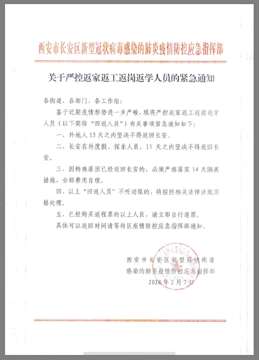 关于转发《长安区疫情防控指挥部关于严控“四返人员“的紧急通知》的通知