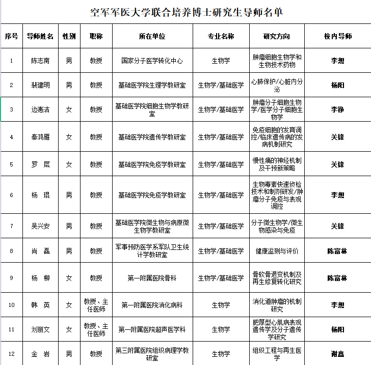 空军军医大学联合培养博士研究生导师名单